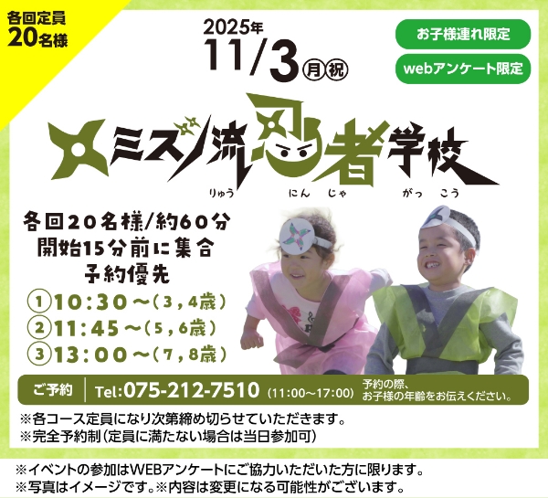 - ①10:30~(3、4歳) ②11:45~(5、6歳) ③13:00~(7、8歳)