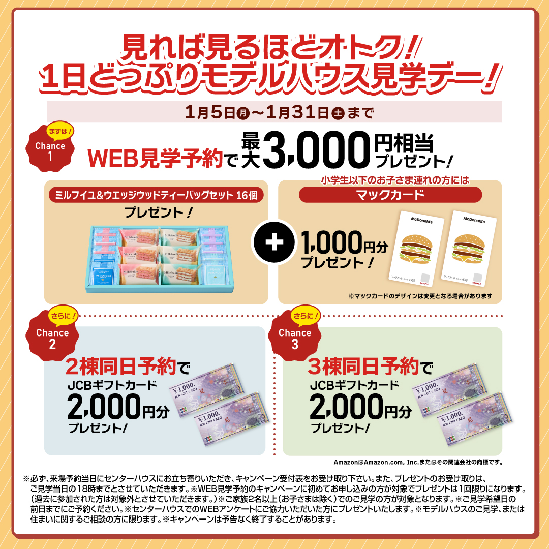 展示場ご来場キャンペーン実施中!!事前にWEBご予約の上、積水ハウスの展示場にご来場で、QUOカードPay3,000円分をプレゼント♪URLよりお申込みください。ご来場予約はこちらから