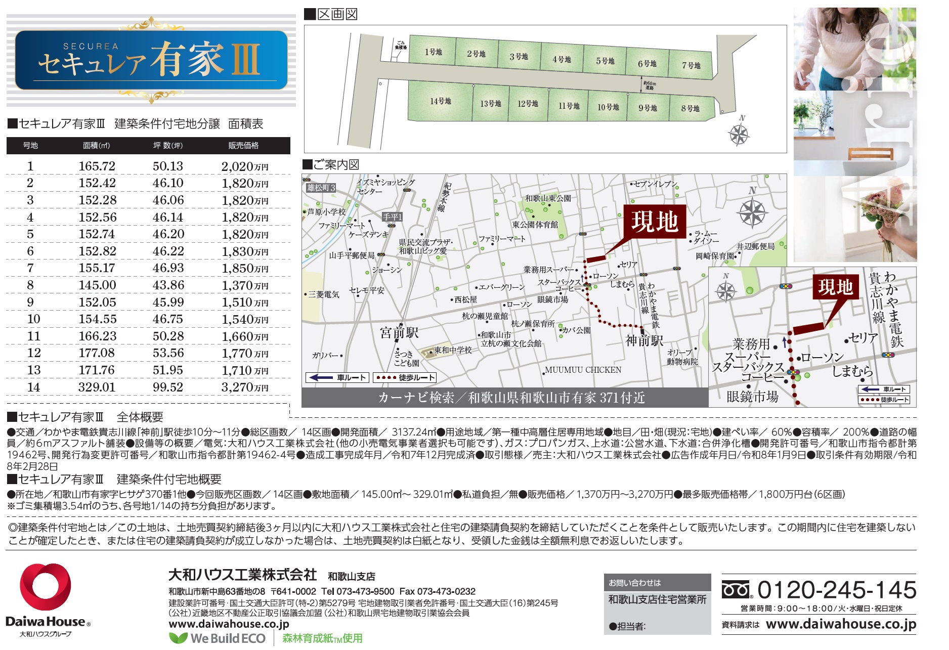 和歌山市有家にてセキュレア有家Ⅲ分譲地14区画販売しております。
