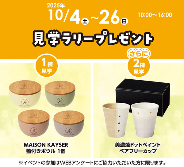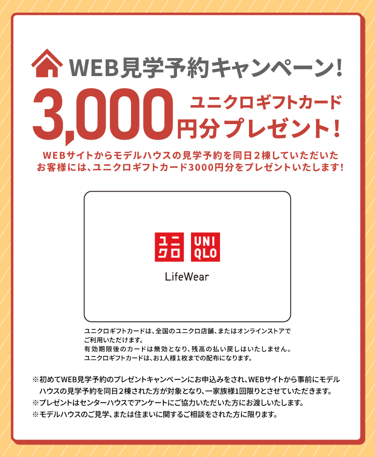 ※初めてWEB見学予約のプレゼントキャンペーンにお申込みをされ、WEBサイトから事前にモデルハウスの見学予約をされた方が対象となり、一家族様1回限りとさせていただきます。※プレゼントはセンターハウスでアンケートにご協力いただいた方にお渡しいたします。※モデルハウスのご見学、または住まいに関するご相談をされた方に限ります。